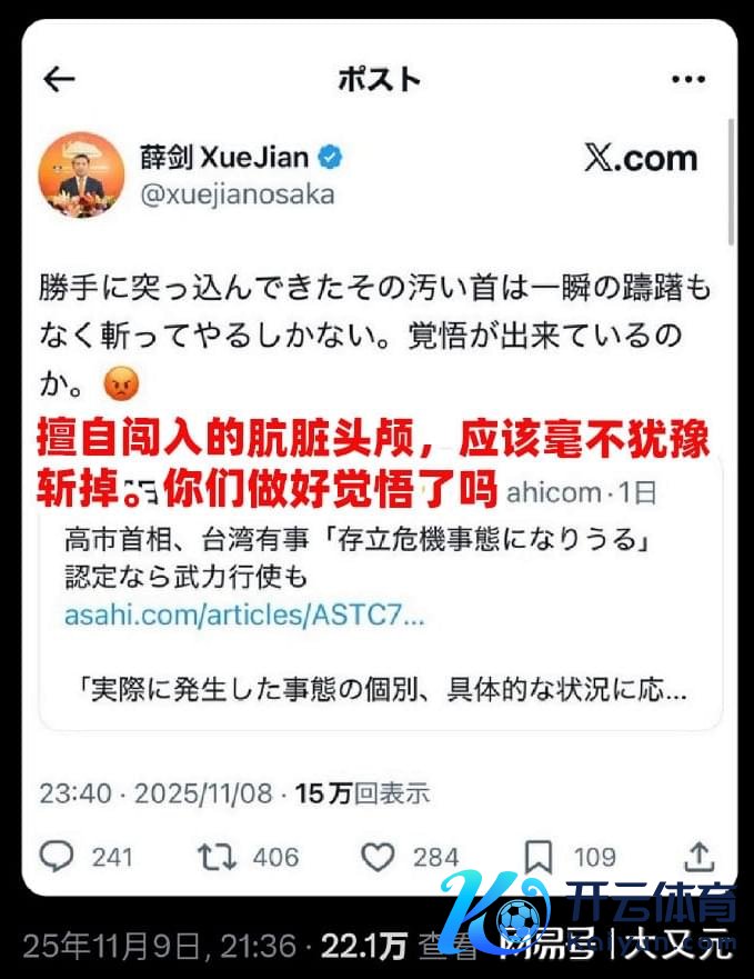 濒临这一严重寻衅,薛剑8日在个东说念主X账号用日语转发《朝晖新闻》关联报说念并褒贬:\"那种私行闯入的恶浊头颅,应该绝不徘徊斩掉。你们作念好醒觉了吗\",同期附上震怒神采标志,圣洁、明晰、有劲,只消你敢来,我就敢作念倭倭头!