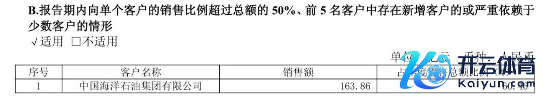 客户汇集度方面,讲演期内,公司前五名客户销售额222.92亿元,占年度销售总数82.26%。讲演期内,公司对中国海洋石油集团有限公司(简称“中国海油集团”)销售额共计163.86亿元,占年度销售总数的60.46%。