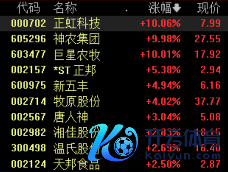 2月13日,猪肉板块盘中动荡拉升云开体育,界限发稿,正虹科技、神农集团、巨星农牧3股涨停,*ST正邦涨超5%,新五丰、牧原股份、唐东谈主神等跟涨。