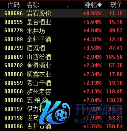 2月13日,白酒股盘初盘中大幅拉升开云官网切尔西赞助商,戒指发稿,岩石股份涨停,皇台酒业涨超5%,水井坊、金种子酒涨超4%,酒鬼酒、舍得酒业、老白干酒跟涨。