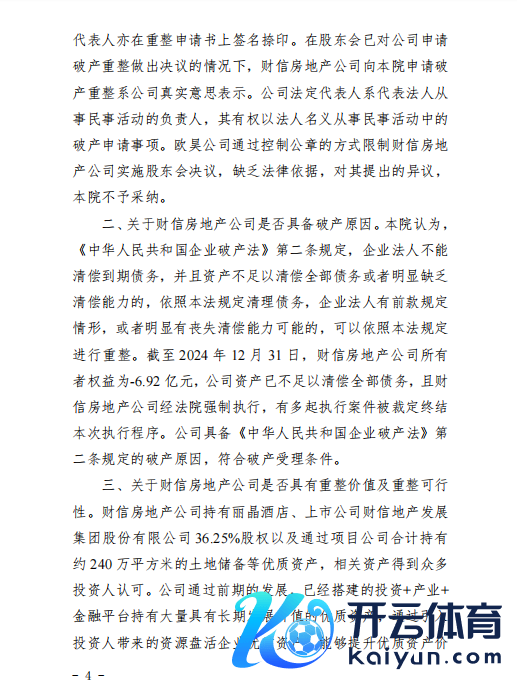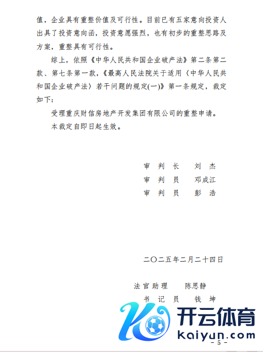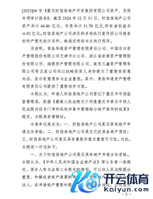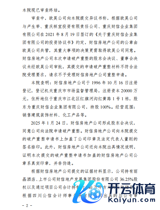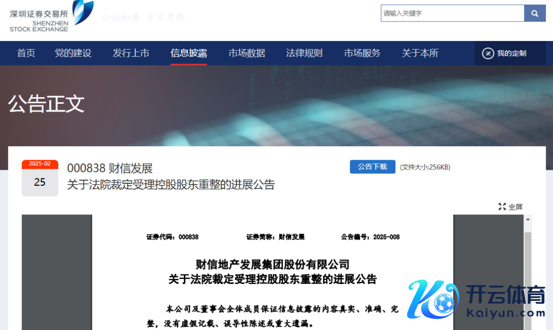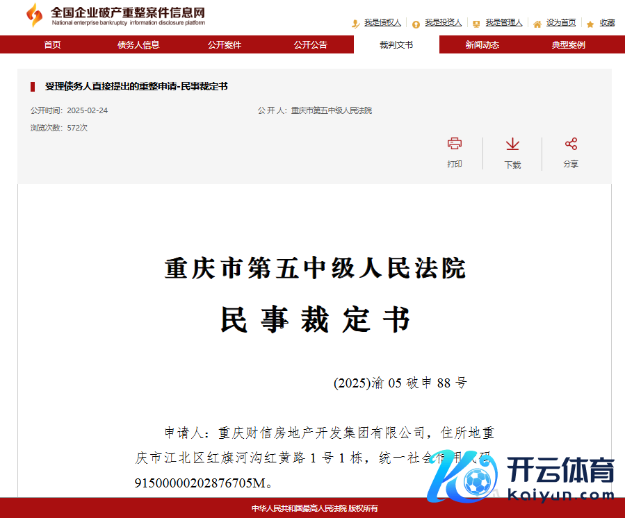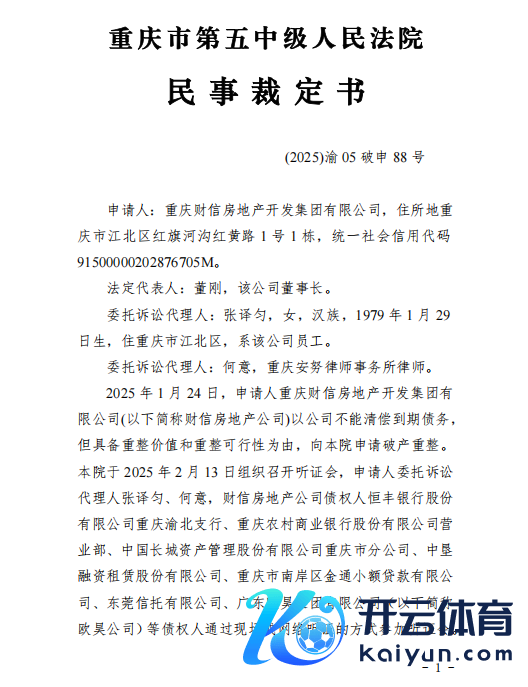 2月24日晚,财信发展发布公告开yun体育网,称重庆市第五中级东说念主民法院于2025年2月24日裁定受理控股激动重庆财信房地产开导集团有限公司和转折控股激动重庆财信企业集团有限公司的重整苦求,财信地产、财信集团插足重整顺序,重整能否告捷存在不笃定性,后续重整实行不抹杀会触及公司戒指权变动。
