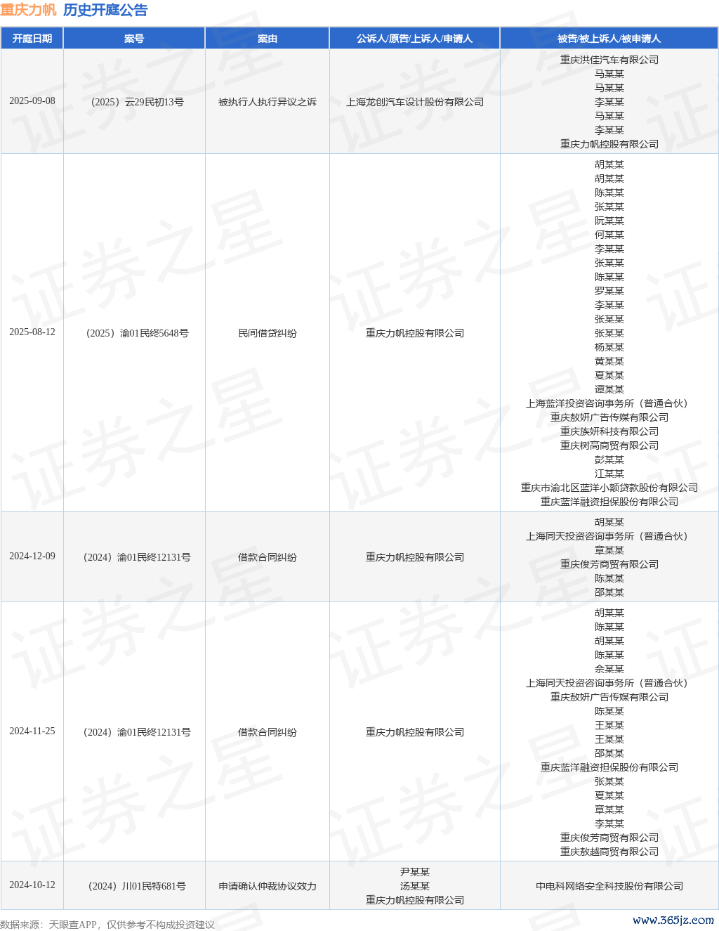 案号:(2025)渝01民终5648号审理法院:重庆市第一中级东说念主民法院案由:民间假贷纠纷当事东说念主信息: 原告/上诉东说念主:重庆力帆控股有限公司 被告/被上诉东说念主:胡某某、胡某某、陈某某、张某某、阮某某、何某某、李某某、张某某、陈某某、罗某某、李某某、张某某、张某某、杨某某、黄某某、夏某某、谭某某、上海蓝洋投资商榷事务所(世俗搭伙)、重庆敖妍告白传媒有限公司、重庆族妍科技有限公司、重庆树高商贸有限公司、彭某某、江某某、重庆市渝北区蓝洋小额贷款股份有限公司、重庆蓝洋融资担保股份有限公司开庭日历:2025年8月12日凭证统计,近一年内以重庆力帆控股有限公司为当事东说念主的历史开庭公告有5则,其中案由为“借债合同纠纷”的公告以2则居首,其次为“民间假贷纠纷”有1则,“肯求说明仲裁公约遵循”有1则。历史开庭公告如下: