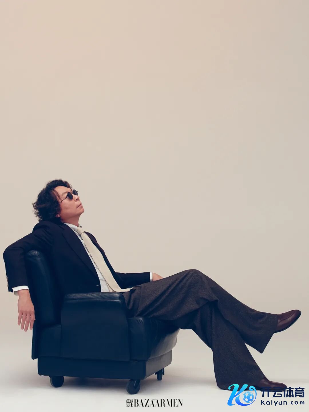 卡其绿廓形夹克、灰色羊毛长裤、玄色小牛皮通顺鞋均为Loewe