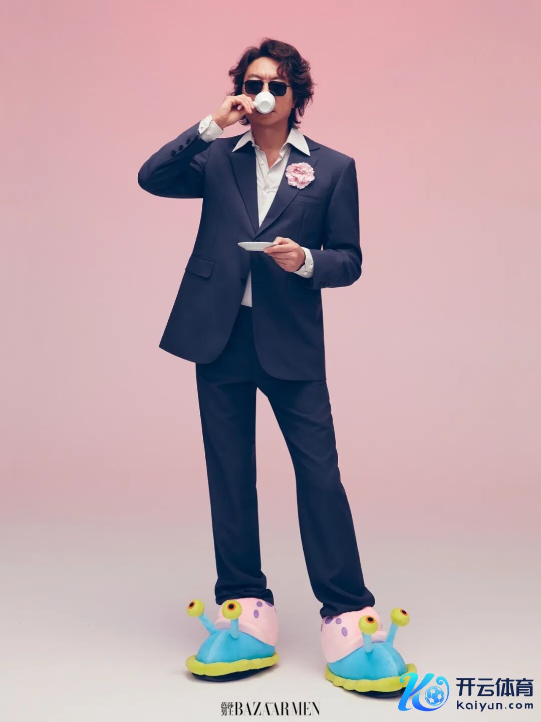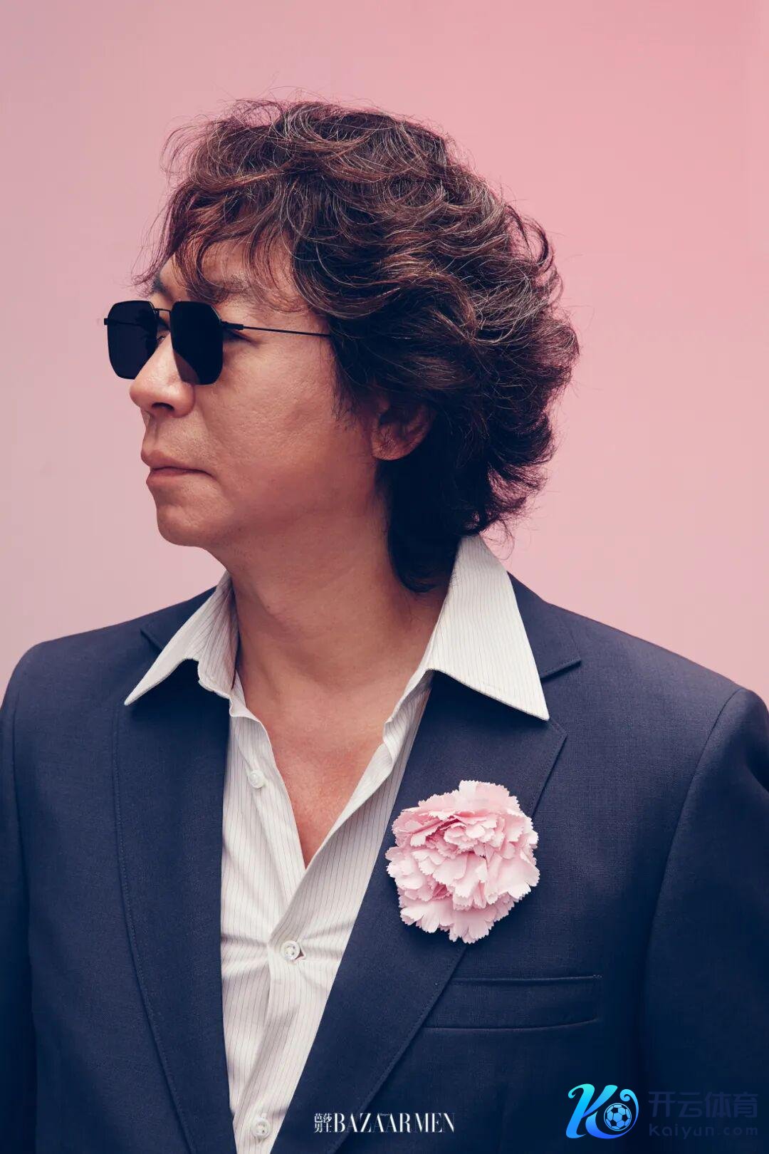 深灰色西装、白色条纹衬衫、深灰色西裤、粉色花朵胸针均为Prada
